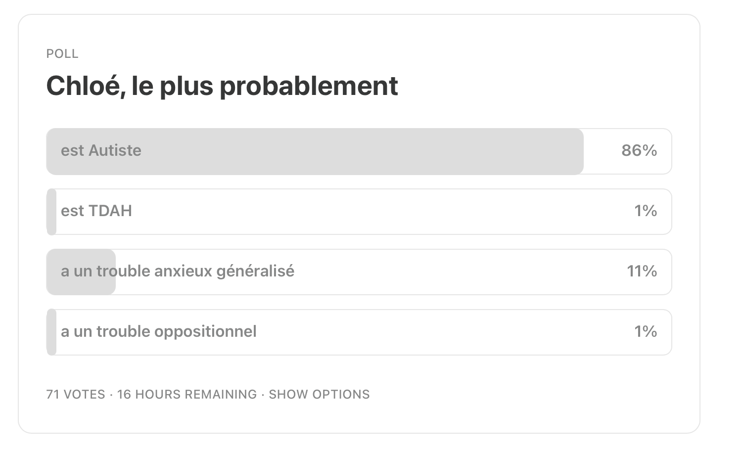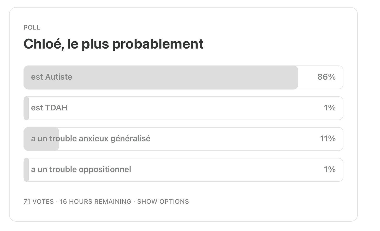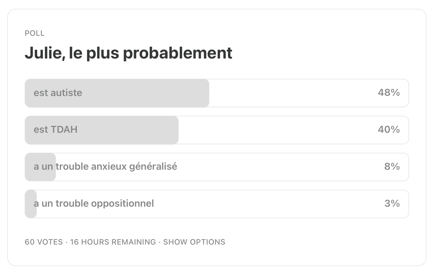 Je suis très curieux de savoir quelle est la bonne hypothèse. Exceptionnellement je laisse les commentaires ouverts donc, si tu as coché (ou aurais coché) TDAH, tu peux venir expliquer ton choix en cliquant sur la petite bulle.