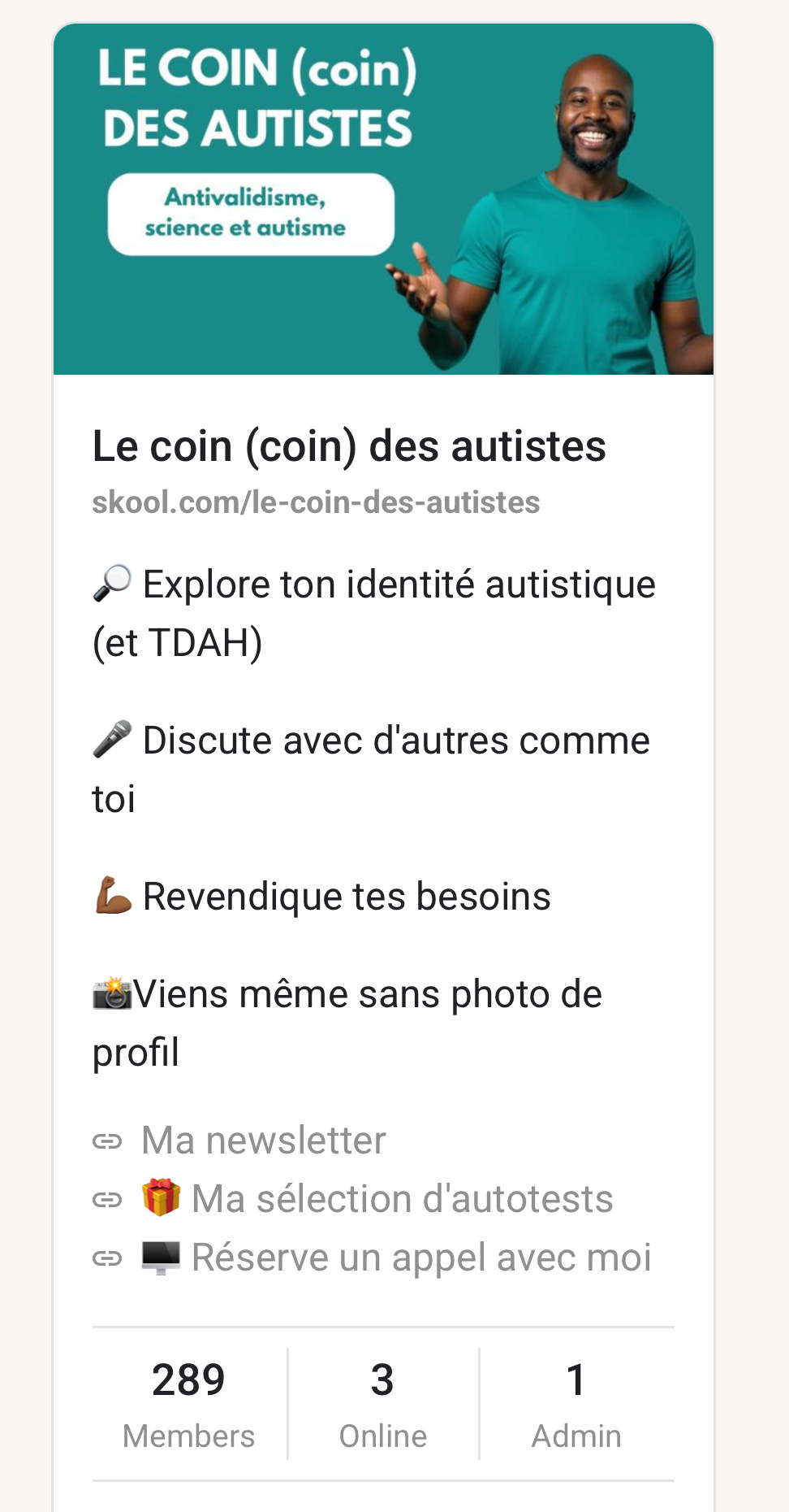 Viens jeter un coup d’oeil : https://www.skool.com/le-coin-des-autistes