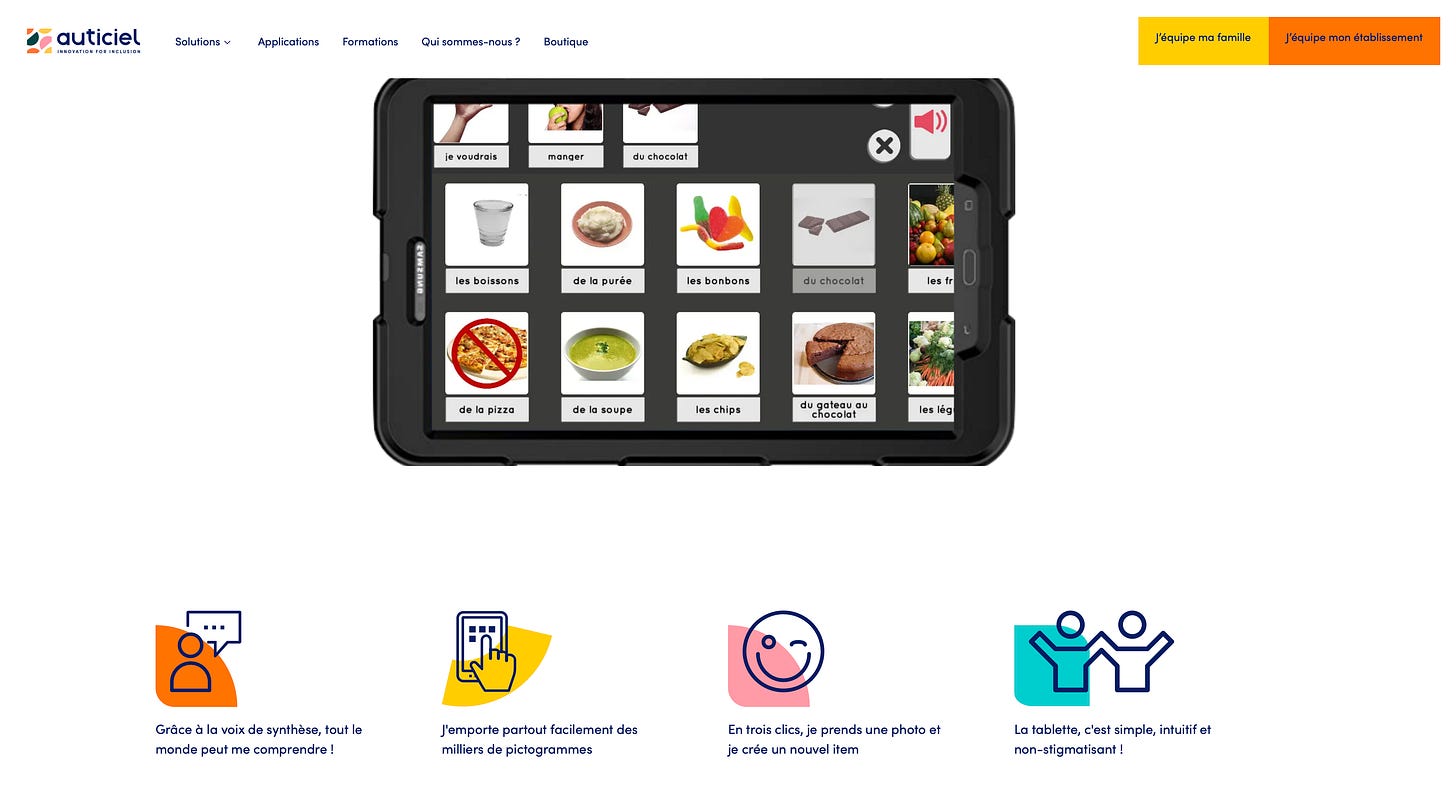 Quand j’étais en école de commerce, y’a une Startup qui marchait super bien dans l’incubateur de startups : Auticiel. Elle proposait précisément des solutions de communication alternative améliorée. Que ça soit avec des applications ou même des tablettes dédiées.