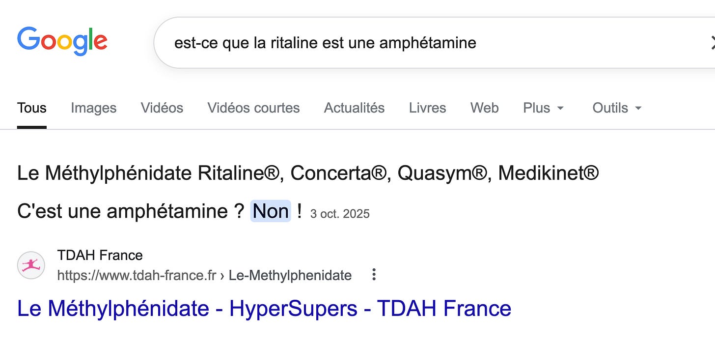 Je mets des guillemets car c’est le nom de la marque. Le vrai nom c’est le méthylphénidate et y’a plusieurs marques. Ce n’est d’ailleurs pas un détail car tu as des effets différents.