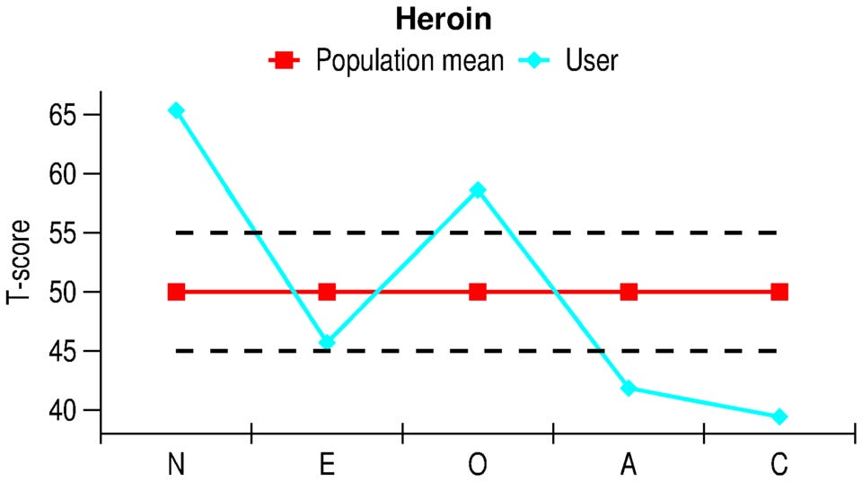 Sur ce graphique on voit que les personnes qui consomment régulièrement de l’héroïne scorent plus haut que la moyenne sur le névrosisme et l’ouverture et bien bien plus bas que la moyenne sur la conscienciosité