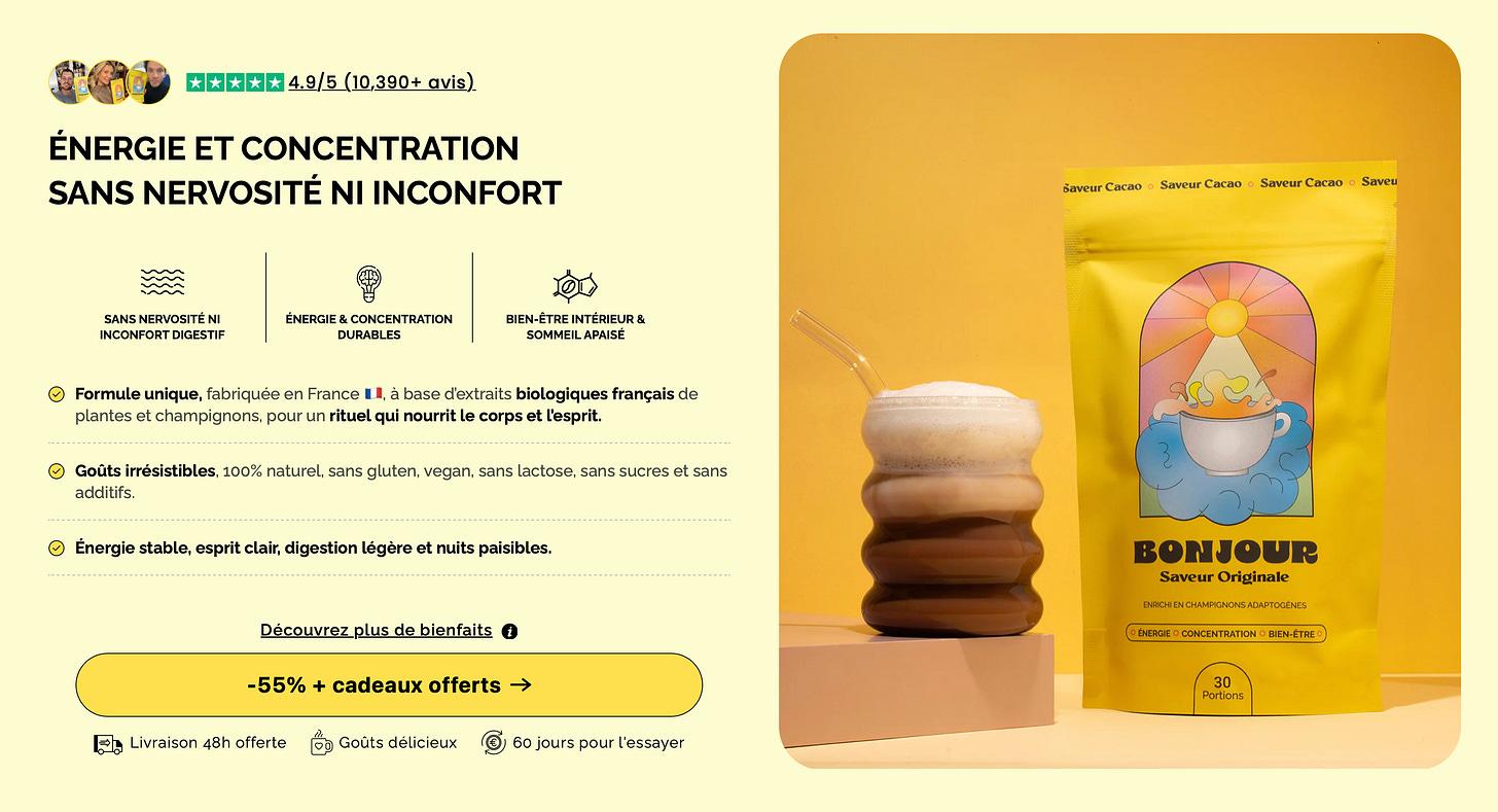 La promesse était alléchante. Mais ça a été un échec total. Ça marche un peu moins bien que le café pour la fatigue. Mais ça marche quasiment autant donc pas mal. En revanche… je trouve pas le goût tellement mieux sans sucre et je n’ai ressenti aucun des autres effets promis.