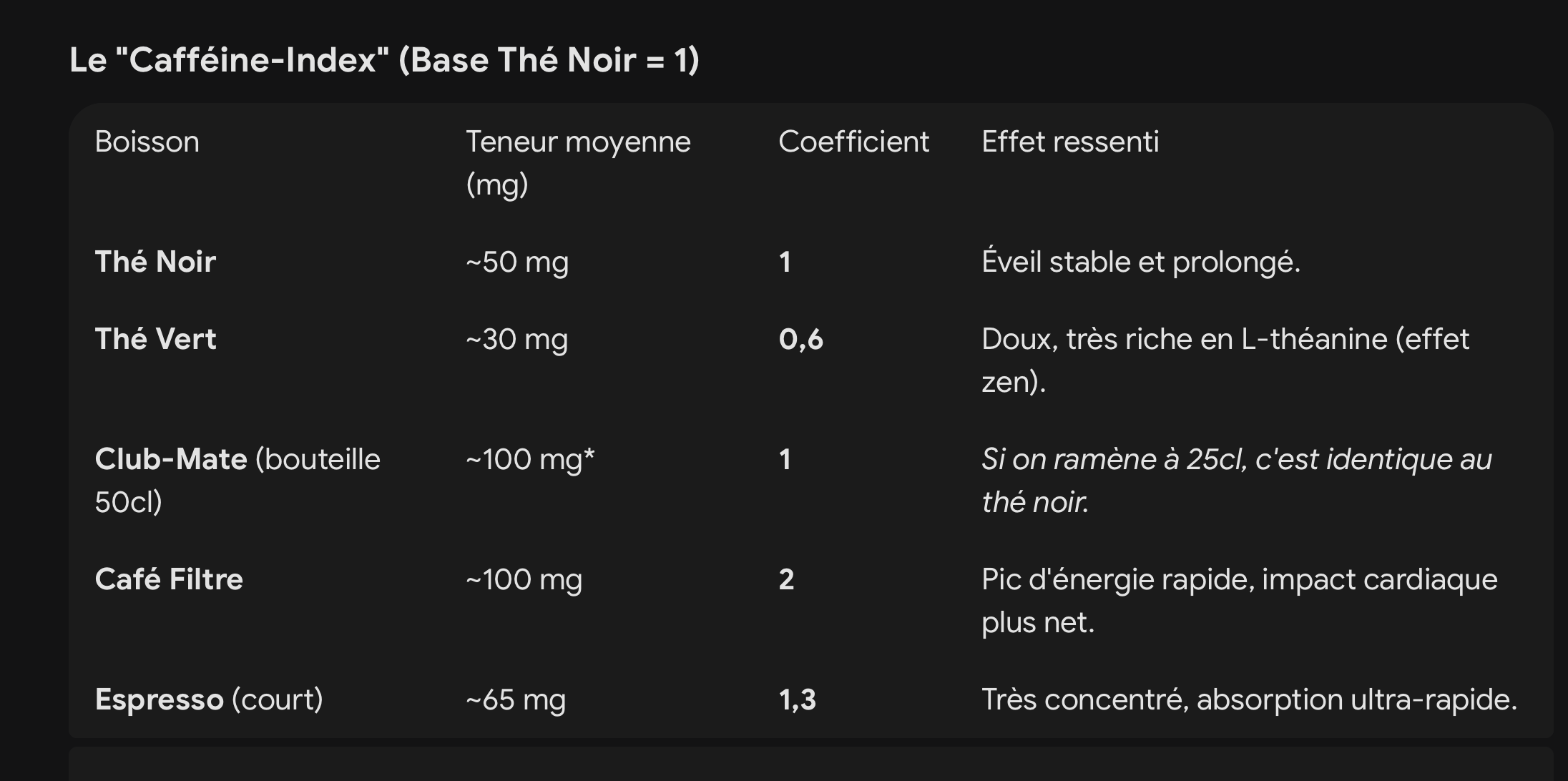 Et ensuite, ya plusieurs paramètres qui rentrent en compte dans les différences d'effets. C'est pas "la caféine du thé va moins vite". La caféine c'est de la caféine, c'est la même chose.