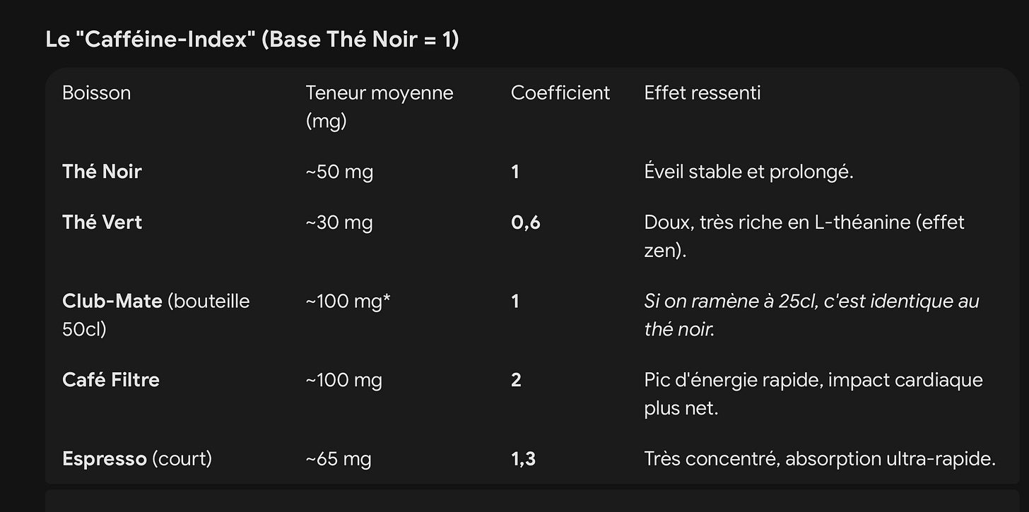 J’ai l’impression que selon la marque de thé noir, la teneur en caféine change, et ça semble confirmé par une boîte qui a écrit “teneur moyenne en caféine”… mais je sais absolument pas comment on sait quelle marque marche mieux