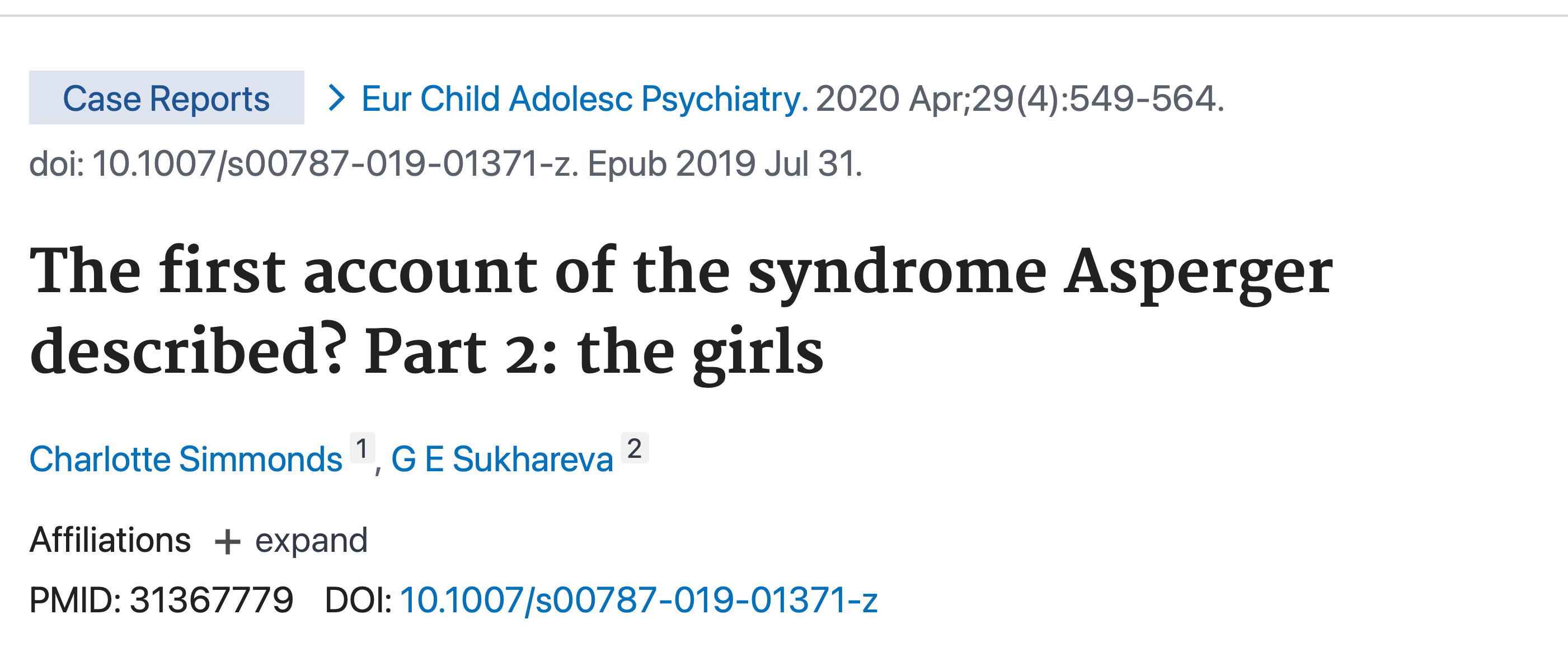 Pour le vol en lui-même… on n’a pas la preuve définitive qu’Asperger a lu les travaux de Soukhareva. Ce qu’on sait c’est qu’elle a publié en allemand dans une revue qu’il lisait régulièrement. On trouve aussi des similitudes dans sa description qui ont fait dire à certains qu’il l’avait plagiée.
