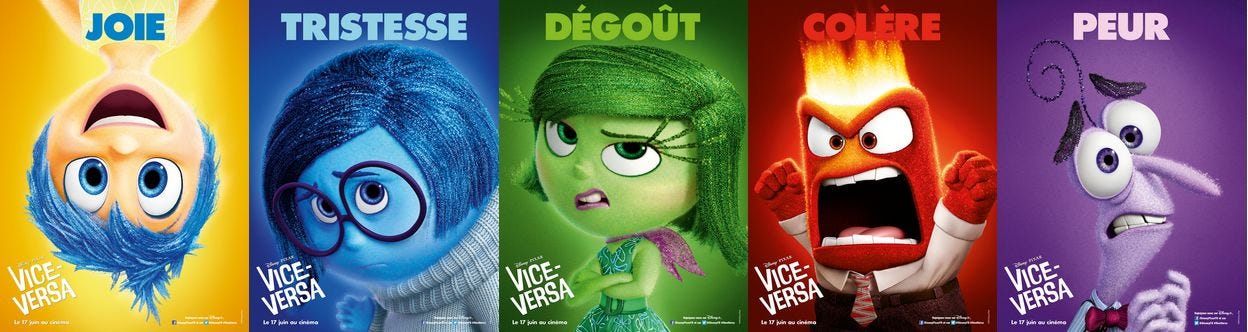 Y’a plein de classification différentes des émotions mais si on prend le modèle de Vice-Versa 1 (oui, oui le dessin animé…Inside out en version originale), alors ça donne :