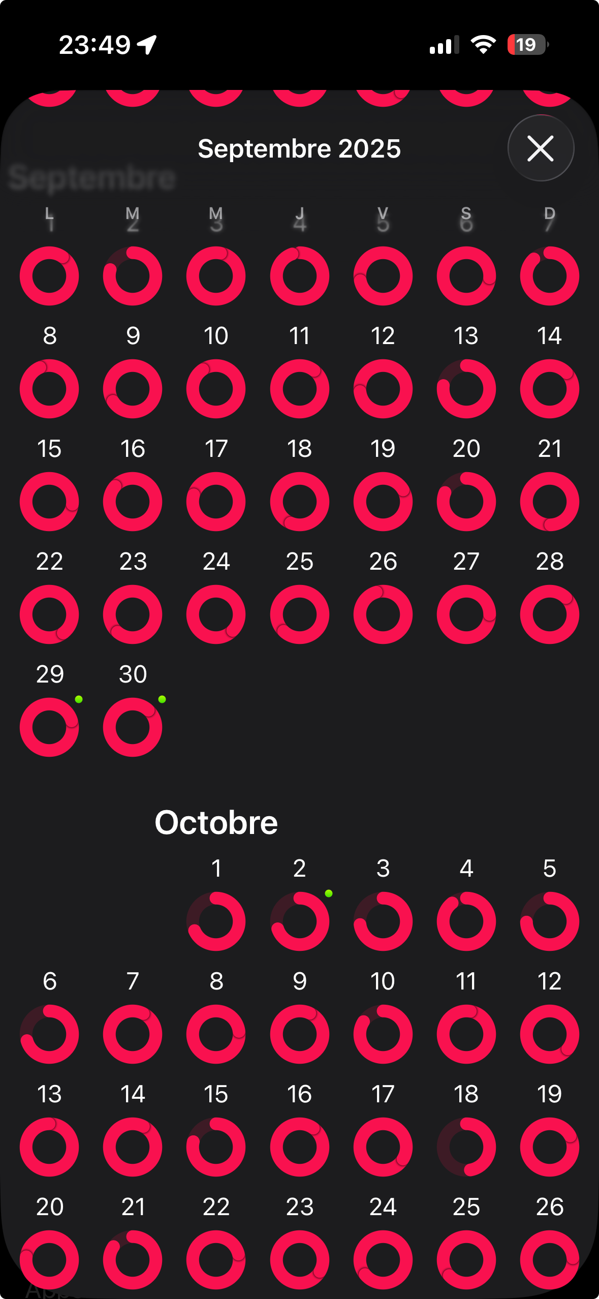 Quand le cercle est complet c’est que j’ai bien fait les 12 000 pas… enfin non… c’est que j’ai dépensé 450 kcal, ce qui correspond plutôt à 9 000 pas quand je marche très vite et 16 000 pas quand je marche très lentement comme ce soir à cause de la neige.