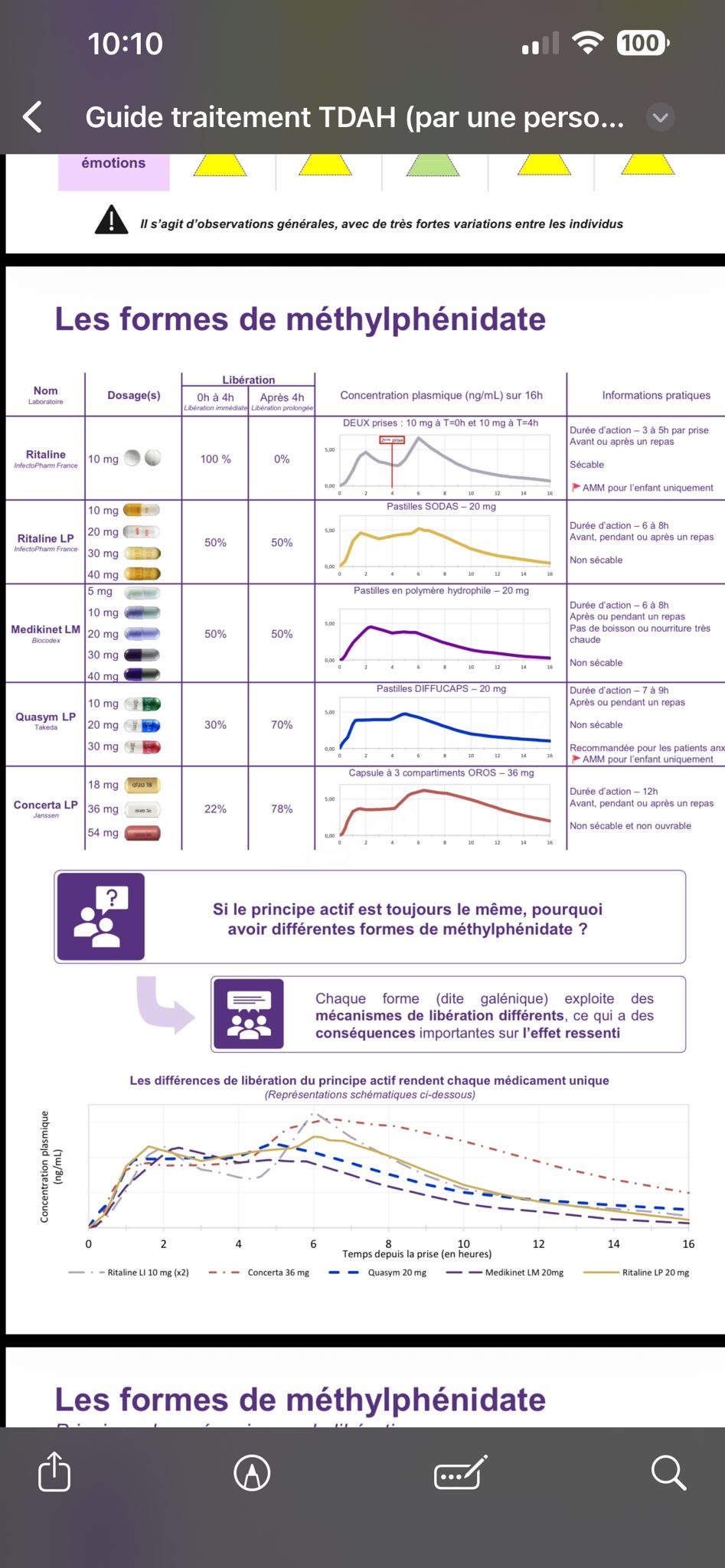 Pour rappel, c’est la même molécule, le méthylphénidate mais qui a une diffusion différente. Comme la caféine dans le café ou dans le thé. On m’a envoyé ce screen qui récapitule :