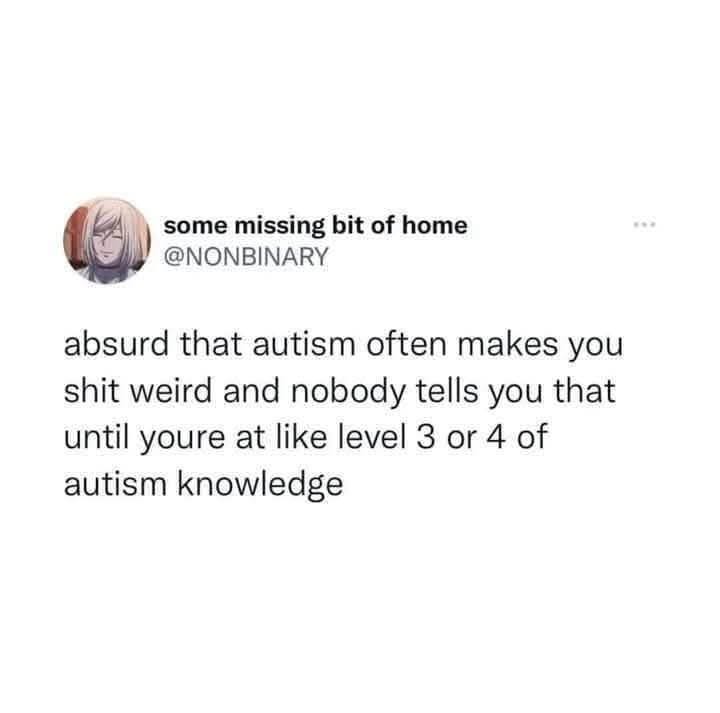 Traduction : c’est absurde que l’autisme te fasses souvent chier bizarrement et que personne ne t’en parle avant que tu sois au niveau 3 ou 4 de ta connaissance de l’autisme.