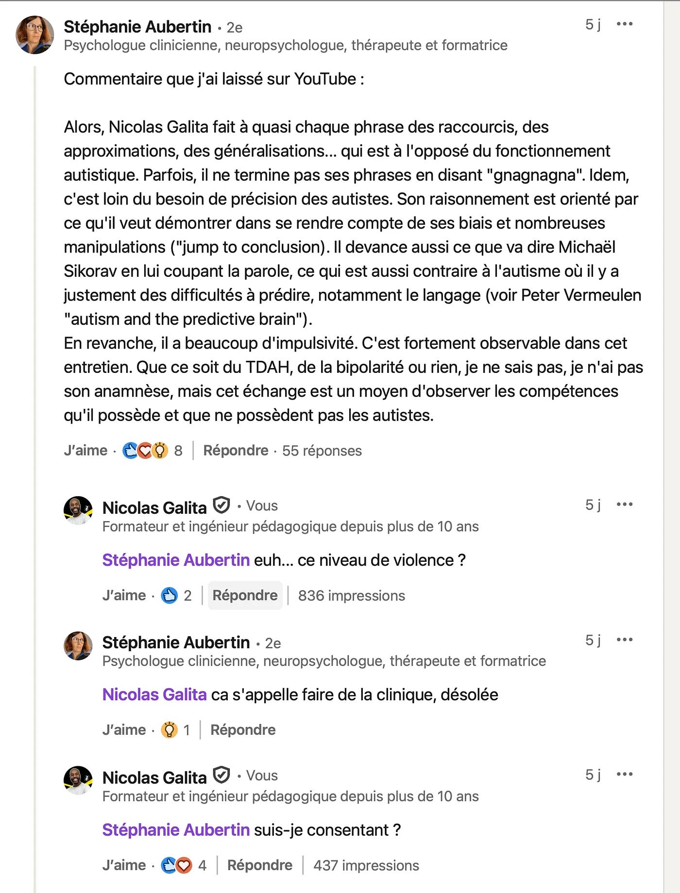 Il devance aussi ce que va dire Michaël Sikorav en lui coupant la parole, ce qui est aussi contraire à l’autisme où il y a justement des difficultés à prédire, notamment le langage (voir Peter Vermeulen “autism and the predictive brain”).